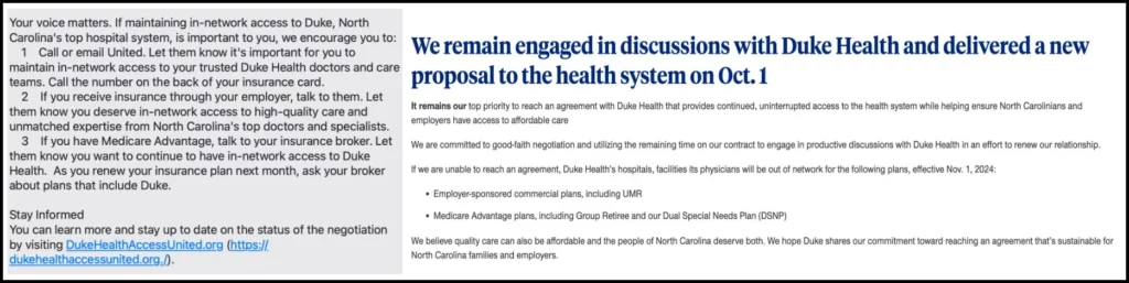 On left: Letter from Duke (10/15/24); On right: Message from UHC (10/16/24)